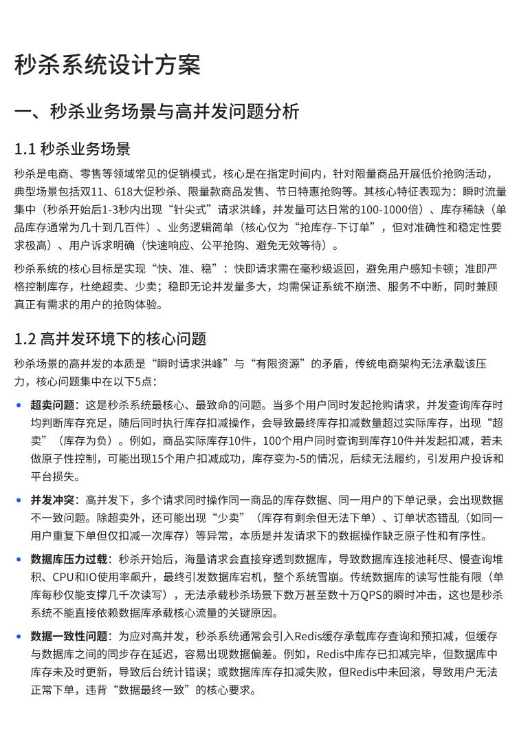 秒杀系统的核⼼⽬标是实现“快、准、稳”:快即请求需在毫秒级返回,避免⽤⼾感知卡顿;准即严